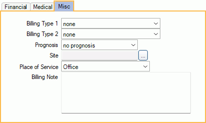 Site: Only visible if Public Health is turned on in Show Features. Defaults to the patient's Site (set in Edit Patient Information: Public Health Tab). Click [...] to select the site where the procedure was done. This site determines the default place of service set on the Edit Claim - General Tab. See Site List.