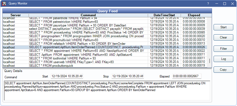 This window can remain open in the background to allow monitoring during normal use of the program. Activity displayed is only from the instance of Open Dental from which it was launched. It does not monitor all queries being processed by the MySQL server.