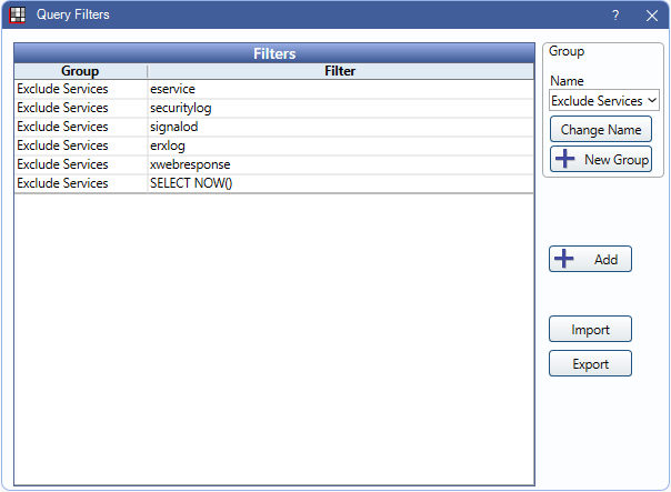 Displays a list of Filters associated with the selected Group Name. Queries containing these Filters are excluded from the Query Feed.