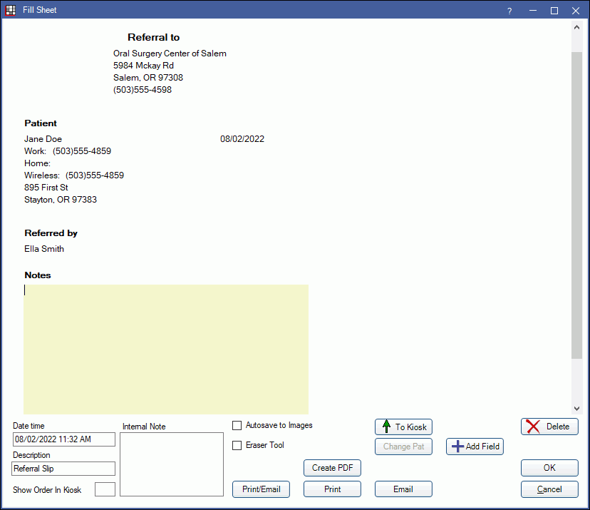 Above is an example of the internal Referral Slip Layout. Add notes in the pale yellow area as needed. Referral slips can be customized and associated to a specific referral source in the Referral List.