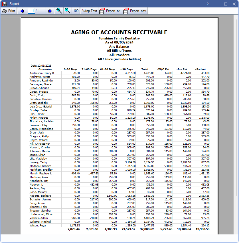 - -W/O Est: The insurance write-off estimate amount based on the procedures attached to the claim. Only shows if Age write-off estimates is unchecked and there are still unreceived write-off estimates as of the report date.