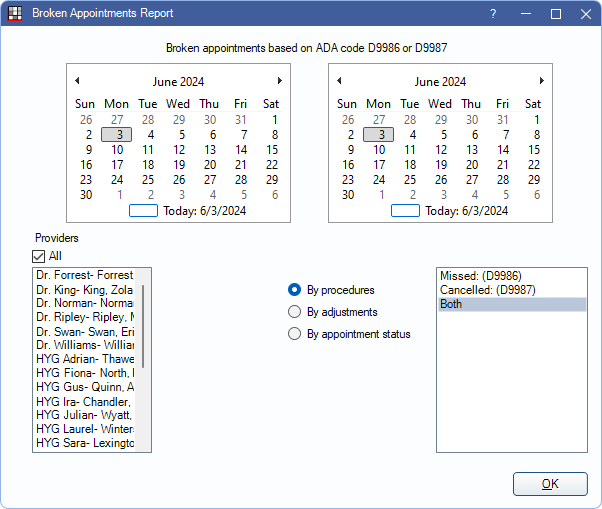 - If Broken appointment procedure type is set to anything other than None, the report defaults to By procedure. Only the selected Broken appointment procedure type procedure codes are available to choose from (e.g., if set to Missed, only the missed procedure code, D9986, is listed and included on the report) If the preference is set to Both, there are multiple options (i.e., missed, cancelled, both).