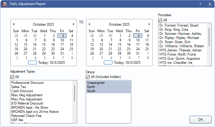 Providers: Select the providers attached to adjustments to include. Check All to include all listed providers.