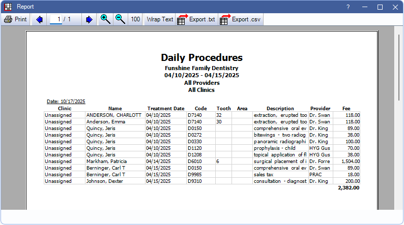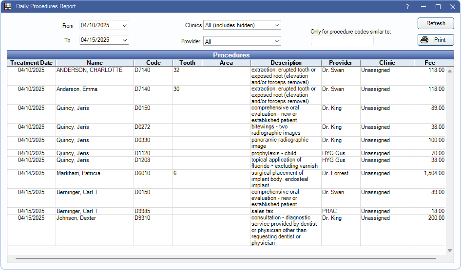 Run the Procedures Report to display details for each procedure completed in the selected date range.