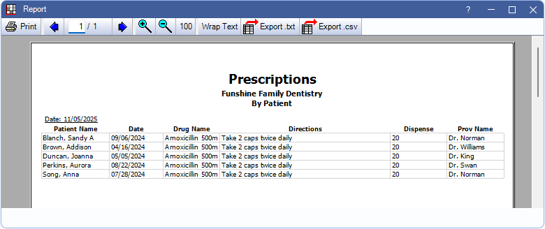 Use the Prescriptions Report to generate a list of all prescriptions created in Open Dental that can be filtered by drug name or patient last name.