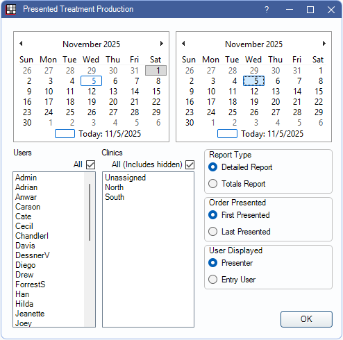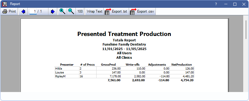 The Presented Treatment Production Report totals the production from completed procedures that are attached to Saved Treatment Plans.