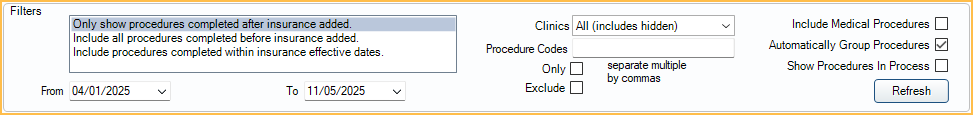 Include Medical Procedures: Check to include unsent procedures for patients who have medical insurance. If unchecked, unsent procedures for insurance plans marked Medical are excluded.
