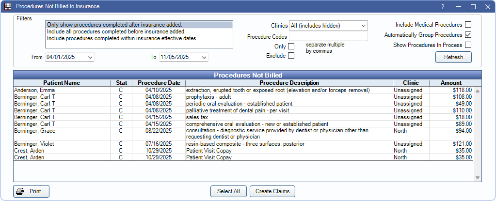 All procedures on this list should either be billed to insurance or marked Do Not Bill to Ins in the Procedure Info window. Procedures only appear if the procedure has a fee and the patient has an active insurance plan.