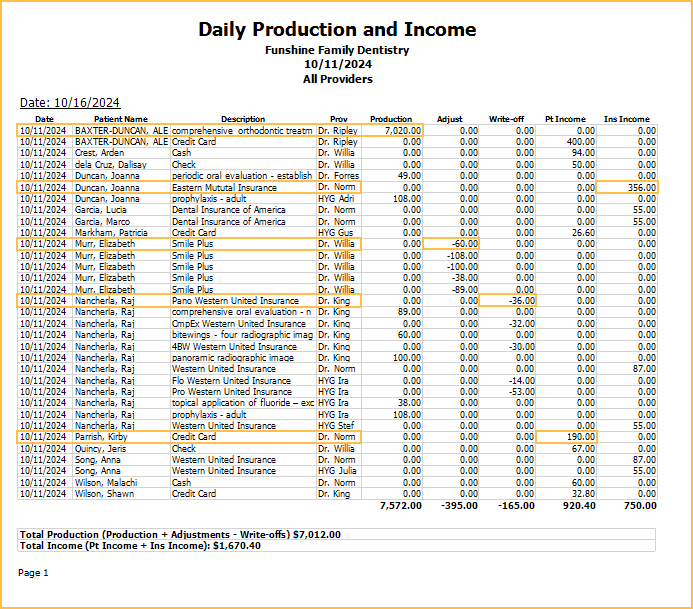 The Daily Report Type displays an itemized list of all production and income for the selected date range, provider(s), and clinic(s). Each item appears on its own line on the report. For example, an adjustment shows on a separate line on the report from the procedure production, even if the adjustment was attached to the procedure.