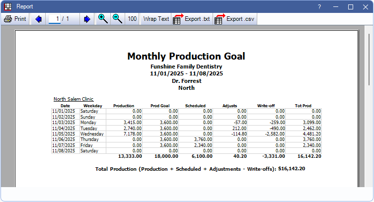 - While write-offs are displayed as a negative amount in the grid, that is only for visual emphasis. This does not result in negative amounts being subtracted in the production totals using the equations defined above.