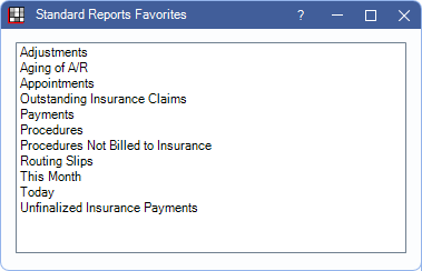 - Standard Favorites: Displays reports marked as Favorite in Report Setup: Display Settings.