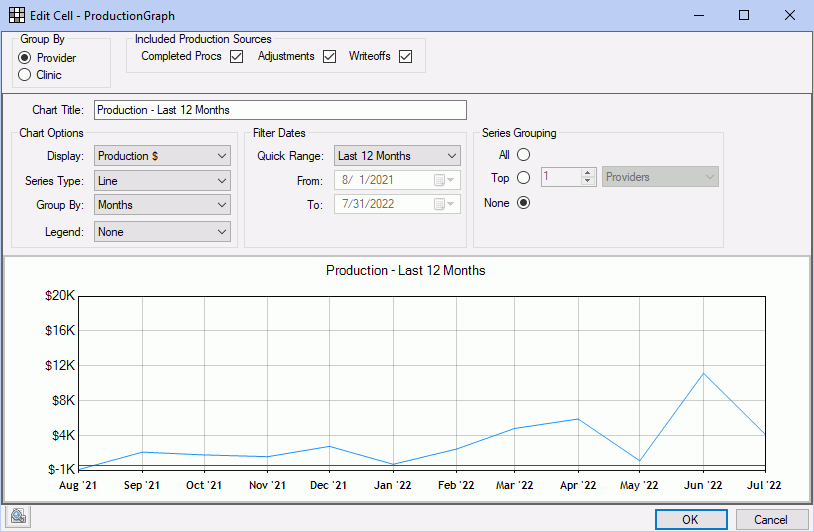- Included Production Sources: The production sources to consider when generating a Production report. Options include Completed Procs (Procedures), Adjustments, and Write-offs (by procedure date).