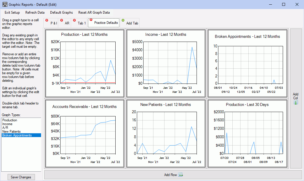 Graphic Reports Setup Mode is where changes can be made to the graphic report tabs, the reports in each tab, and the settings for each individual report.