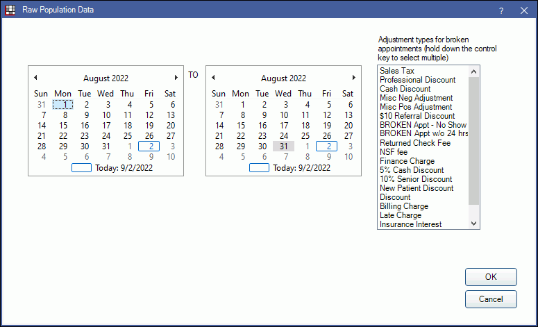 Adjustment types for broken appointments: Select the Broken Appointment adjustment type used by the practice. Ctrl + click to select multiple select multiple types. At least one must be selected. This will be used to calculated NumberBroken on the report and will also include patients who had a broken appointment, even if there were no completed procedures in the date range.