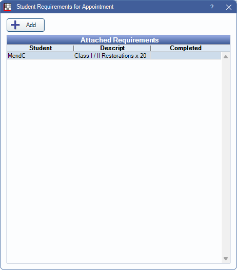 Adding requirements to appointments is useful for Dental Schools. Requirements that are in progress or have been completed are listed in the Attached Requirements grid.