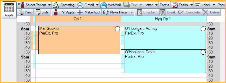 Appointments Module: The Appointments Module displays the provider in each operatory with their corresponding provider color.