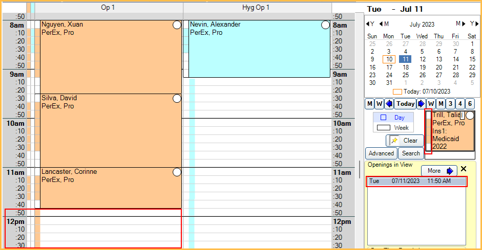 - When the Search Behavior preference is set to Provider Time Operatory, the Appointment Search considers both available provider time and available operatory time. In the example below, the provider is set as the primary provider on the Hygiene operatory and there are three blocks of time available for the appointment to be scheduled.
