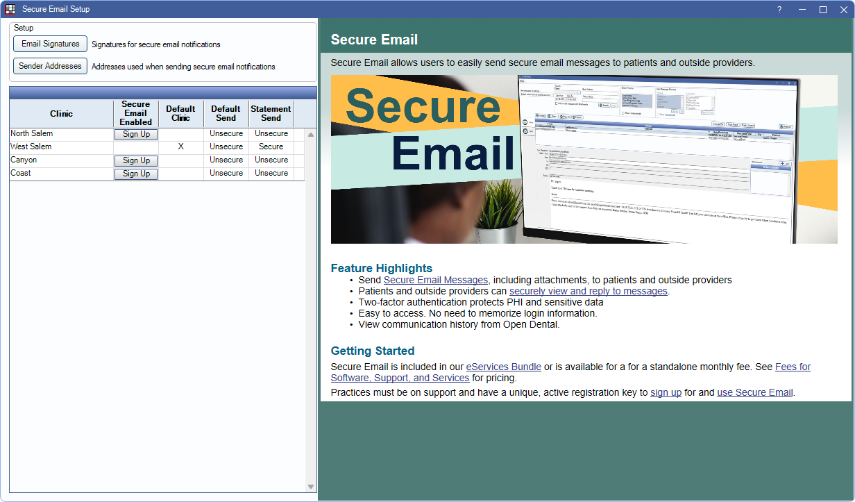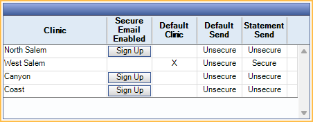 - Secure Email Enabled: X indicates the clinic is currently signed up for Secure Email. Click Sign Up to launch the eServices Signup Portal and enable a new clinic.