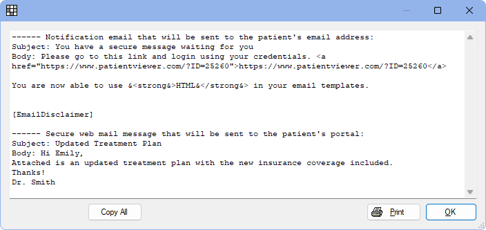 Once sent, the secure message is sent to the patient portal and an email notification is sent to the patient.