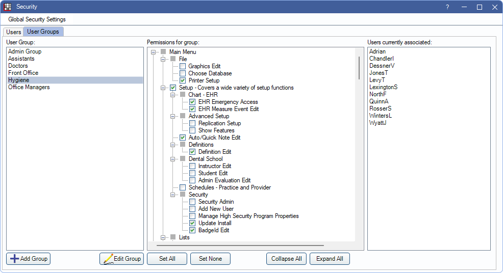Permissions for group: Displays the permissions for the selected user group. Permissions allow or restrict access to a specific action or Open Dental feature. Check or uncheck permissions as needed for the group. For information on what each permission controls, see Permissions.