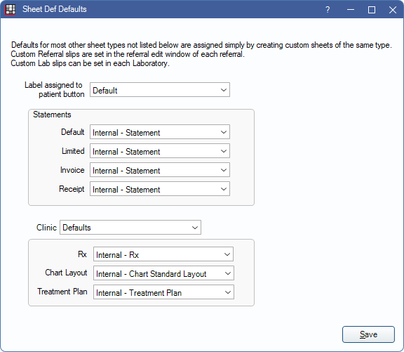 Set default sheets for different statement types. A custom sheet can be used for each type. These settings are the same for all clinics.