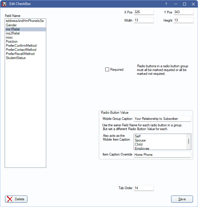 Required: If checked, the user will be required to select an option in the generated form before saving it. If adding radio buttons, all radio buttons in a group should be marked the same: all required or all not required.
