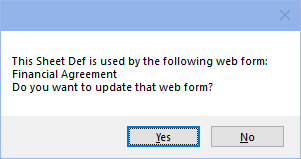 OK: Exit the Sheet Def Edit window and save changes. If making changes to a sheet in use by eClipboard or Web Forms, a prompt displays to update the form in use. See below for details.