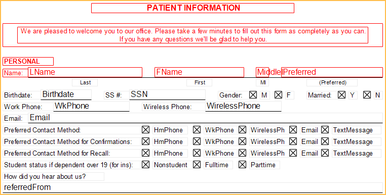 If a blank form is needed (e.g., a patient needs to fill one out by hand), create a dummy patient where the last name is entered as only a period, no other information, as seen below.Generate any forms from this patient and patient information is not pre-filled.