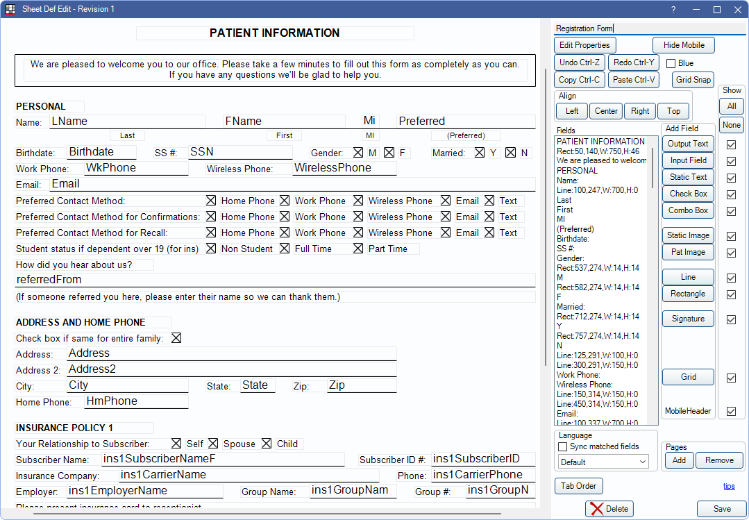 Open Dental has several internal sheets that can be copied and customized for practice needs.