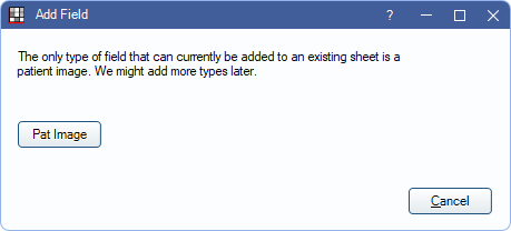 - Click Pat Image to add the field to the sheet. The Edit Image Field window will open. Currently, Pat Image is the only field type that can be added. Additional field types may be available in the future.