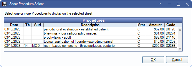 Select one or more procedures from the list, then click OK to add procedures to the sheet. Only procedures treatment planned or completed for the selected patient are listed.