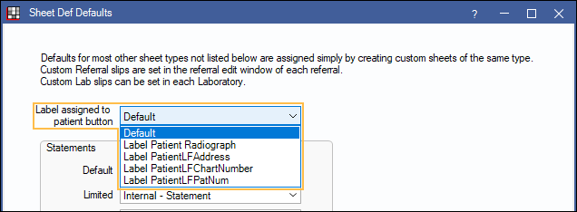 By default, when Label is clicked in the Main Toolbar, the internal Label Patient Mail prints. To change the label that is printed, assign a different label in Sheet Def Defaults Label assigned to patient button.
