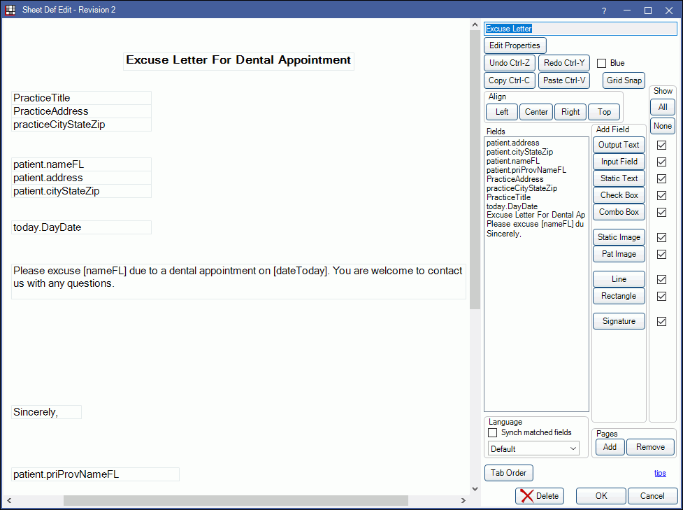 In Patient Letters, fields from custom Exam Sheet can be inserted within a Static Text Field.