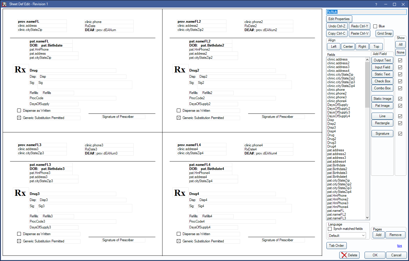 Each Rx template requires a corresponding Prov.NameFL, PatNameFL, PatBirthdate, and Drug output text field. If any of these fields are missing from the sheet layout for a prescription (e.g., there is no Prov.NameFL3 for Drug 3) VOID is printed across the prescription.