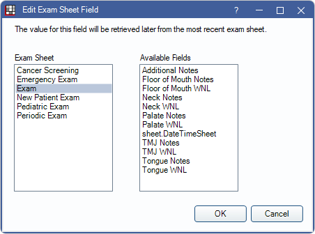 Exam Sheet Field: Insert a field from a custom Exam Sheet within the Static Text box. See Edit Exam Sheet Field on this page for more details. Available for Patient Letter Sheets,Referral Slip Sheets, and Referral Letter Sheets.