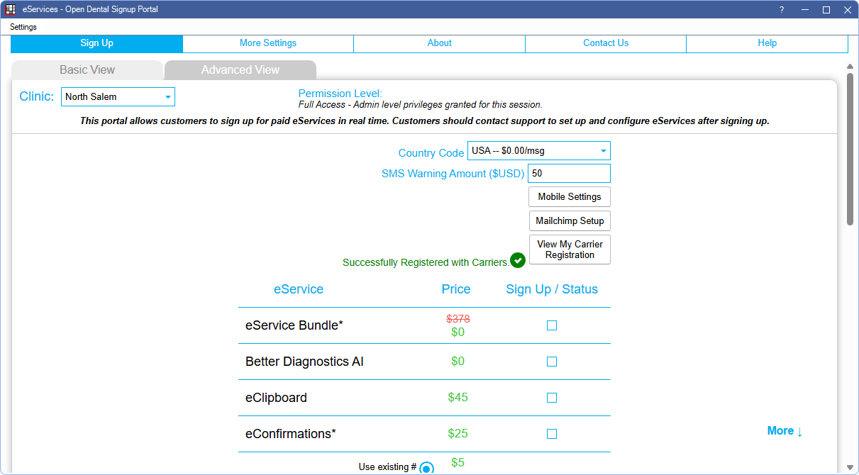 - Checked: eService is currently active. Patient Portal and Web Forms are free for those on support thus they are always active.