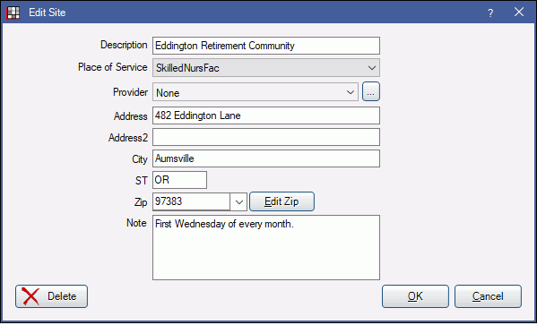 - Provider: Click the dropdown or [...] to select a provider. Click None to clear a selection. The selected provider determines the NPI number submitted in the e-claim, using the X837D_5010_Dental format, when this site is associated to a procedure on the claim. To send the site's NPI number, first create a provider for the site, mark it as not a person then assign it to the site.
