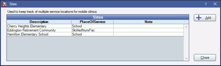 The Site List is a list of sites used in Public Health and by mobile clinics to track treatment performed off-site at grade schools, nursing homes, etc. Sites is only available when Public Health is enabled in Show Features.