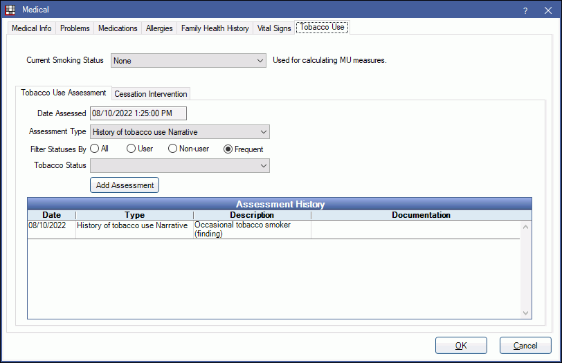 EHR must be enabled in Show Features for the Tobacco Use tab to display. LOINC codes must be imported prior to using this tab.
