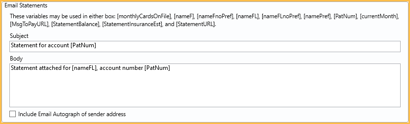 Subject / Body: Edit the default subject and message for statements that are emailed via the Billing List or Account Module. The Body text box supports right-click options.