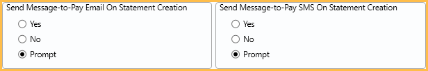 Send Message-to-Pay SMS On Statement Creation: Select the behavior for sending a Message-to-Pay text after creating a statement. SMS Statements template must contain the [MsgToPayURL] tag to send.
