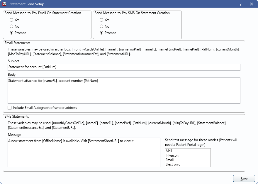 Choose to automatically send a Message-to-Pay email or text when the first statement of the day is created using the Email Statements or SMS Statements template. Statements are created when clicking the Statement button from the Account Module, or when using PatPortal, Print, Email, or Save from the Statement Window when the statement is created from the Account Module.