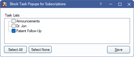 Manage Blocks: Block Task popups for specific Task Lists. Select the lists to block, then click Save. Tasks in selected lists do not pop up, but are still shown in the New for User tab until read.