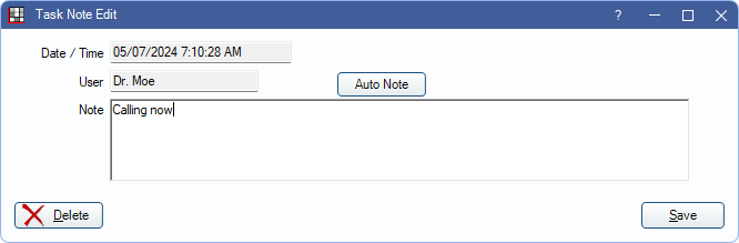 Add: Opens the Task Note Edit window to add comments and notes to the Task.