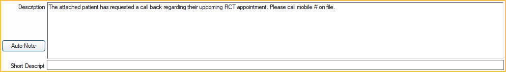 Short Descript: Type a brief description of the Task. This displays in the Task List or Tasks Area instead of the full description or notes. Users can double-click to view the entire Task.