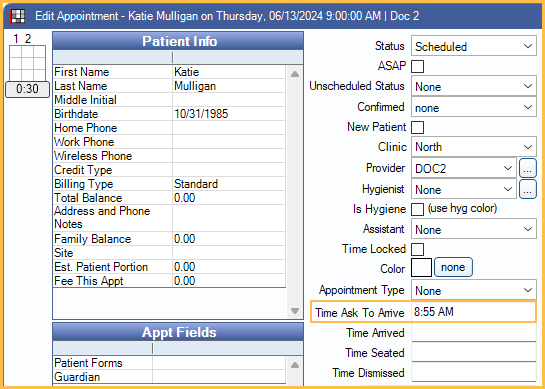 In the Appointments Module, double-click an existing appointment. In the Edit Appointment window, enter the Time Ask To Arrive in 00:00 format.