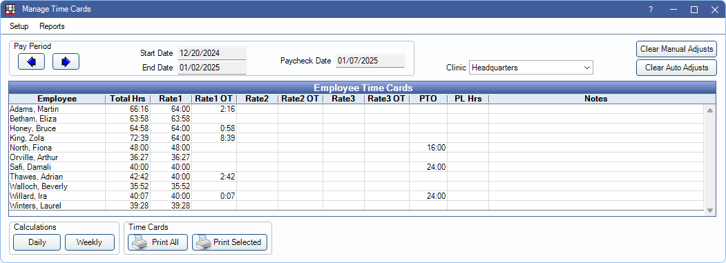 Clinic: If using Clinics, select the clinic to manage time cards for. If a user is restricted to specific clinics, only accessible clinics are listed. All employees who have clock events for the selected clinic during the pay period or who are assigned to the clinic are listed.