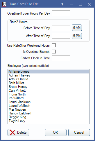 - Delete: Click to remove the time card rule. This rule will no longer apply when running time card calculations.