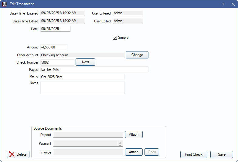 - Memo: Optional. Notes to identify this transaction. To enter a different memo for the Other Account, uncheck Simple.