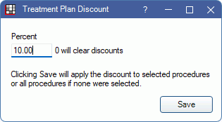 Discounts can be applied to treatment planned procedures by a percentage or a specific dollar amount.